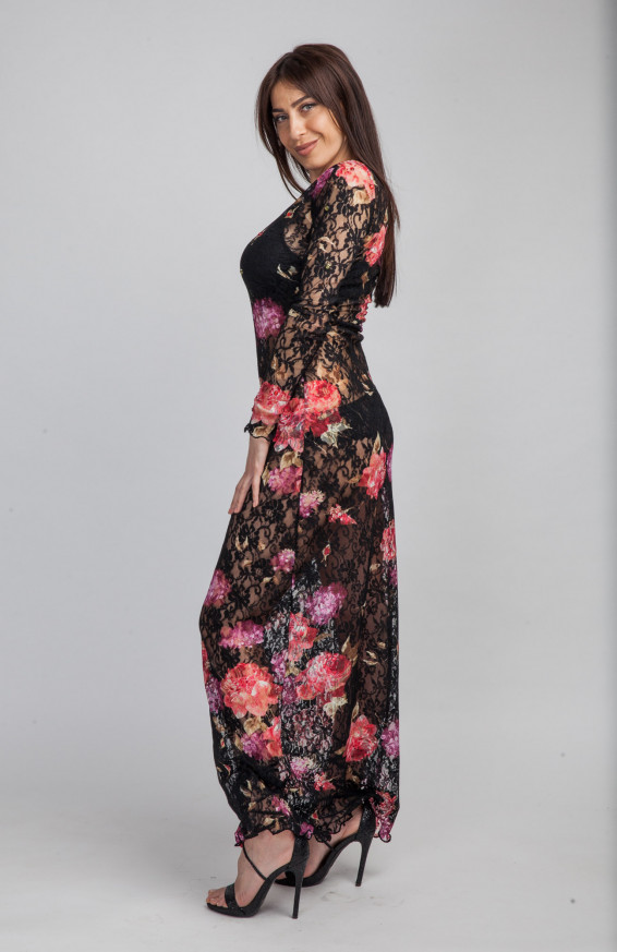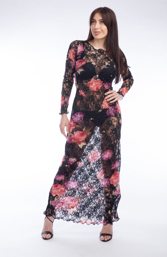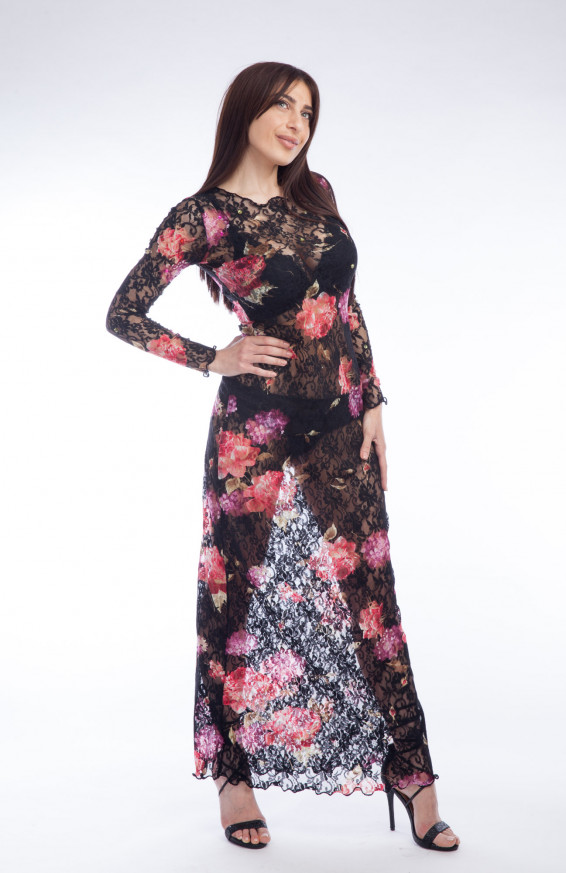 Дълга рокля, изработена от еластична щампирана дантела, декорирана с пластмасови камъчета.
