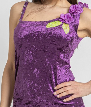 Мини асиметрична рокля, декорирана с 3D цветя, пайети и камъни. Изработена от еластичен плюш. 80% полиестер, 20% еластан
