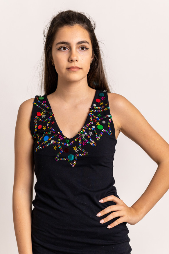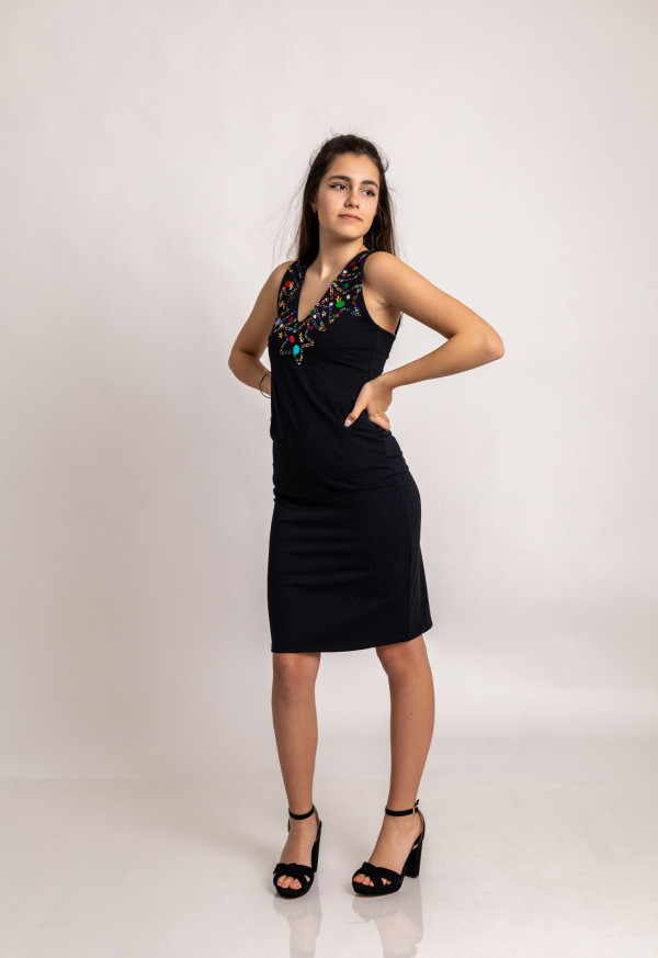 Мини черна рокля, изработена от меко трико, декорирана с пайети.