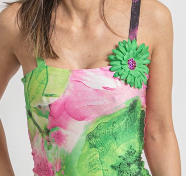 Мини щампирана рокля с презрамки, декорирана с 3D цвете. Изработена от жарсе.