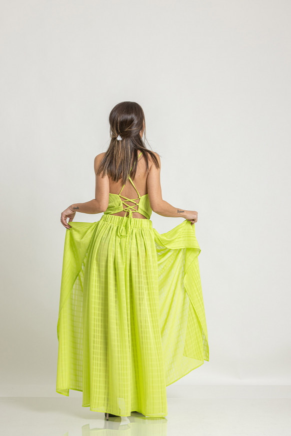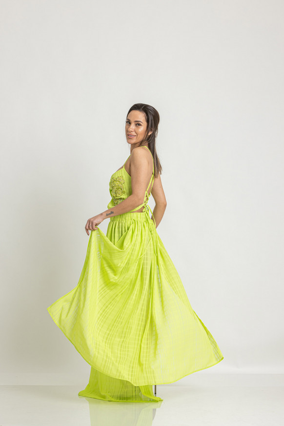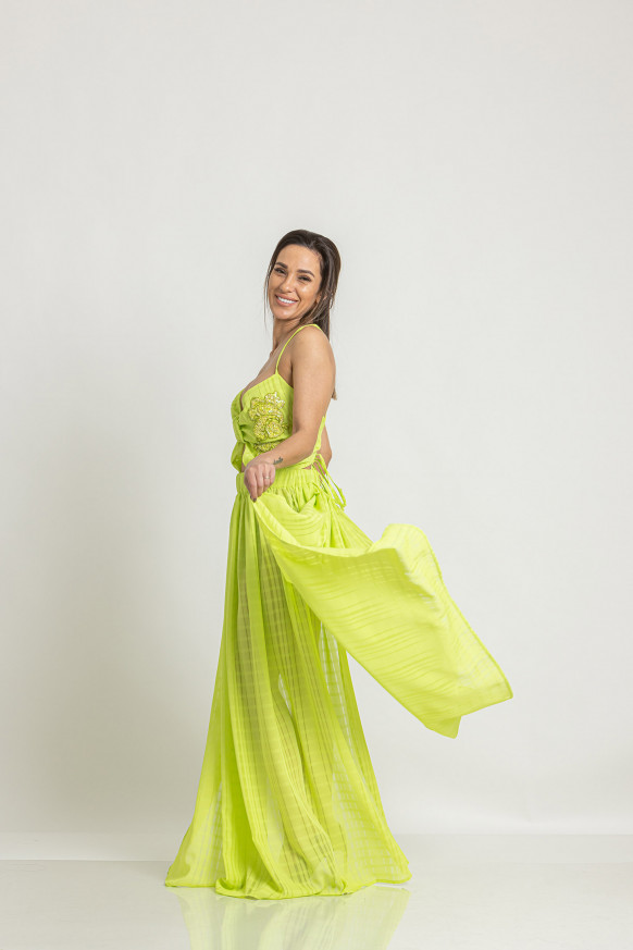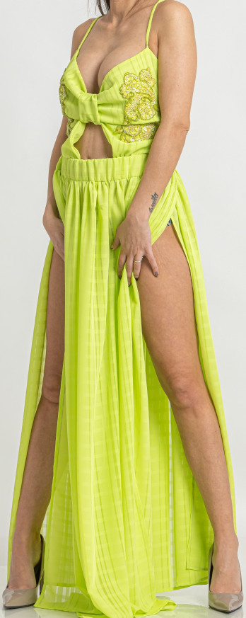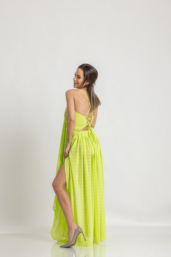 Chiffon long dress with slits on both sides, bare back and handmade decorations with sequins and glass beads.