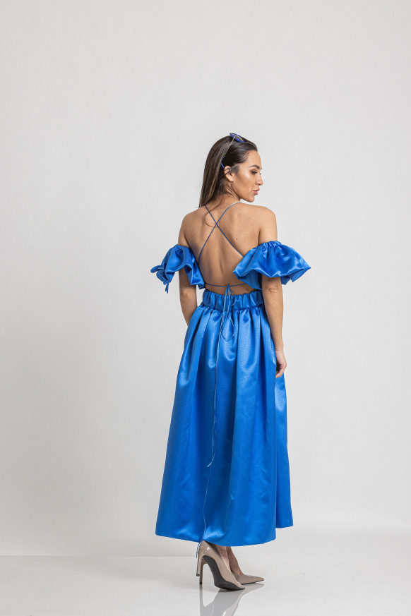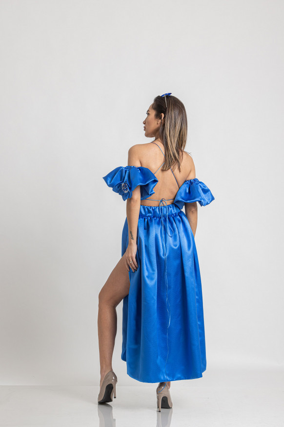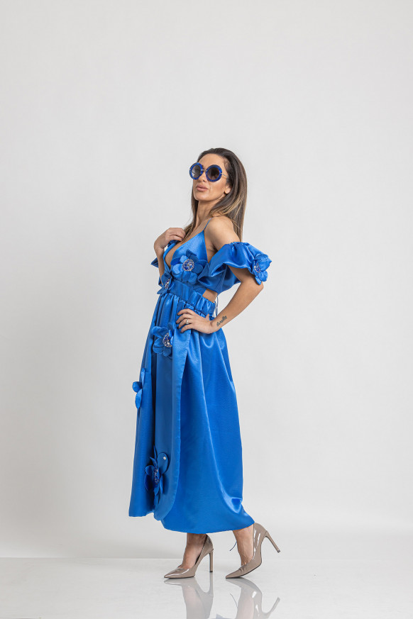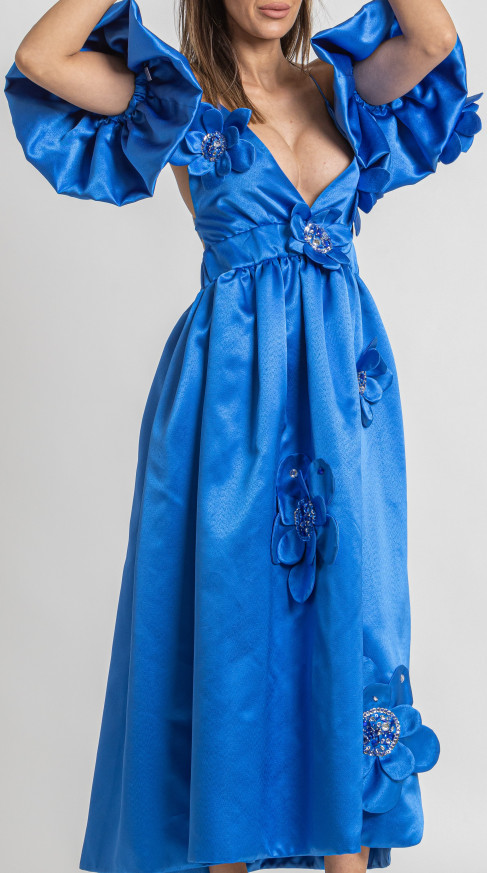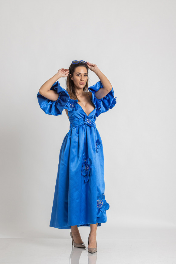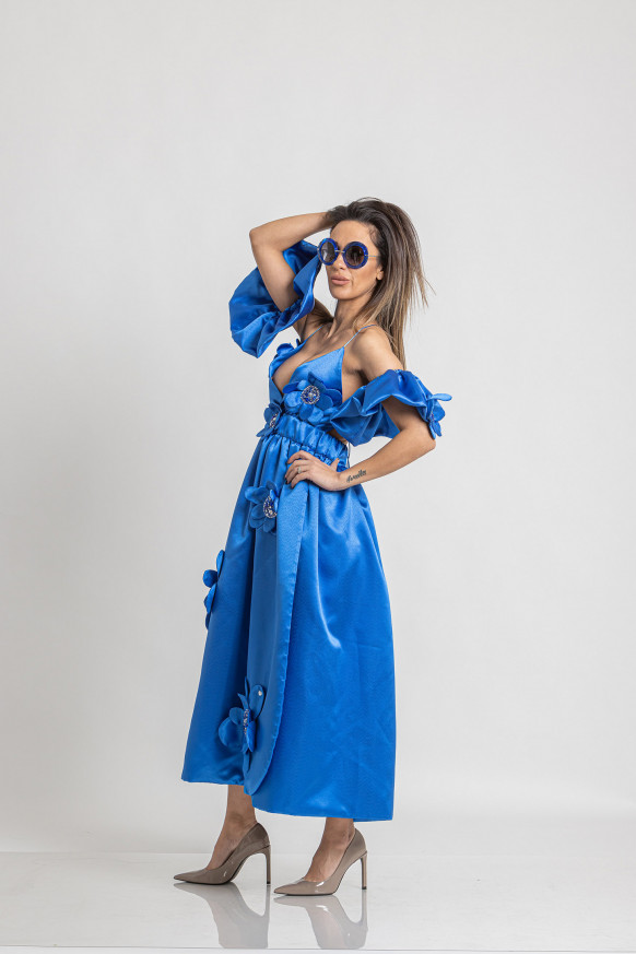 560,00 BGN / € 286,32Midi satin dress with bare shoulders, bare back and side slit. Removable wings type sleeves. Decorated with 3D flowers, stones, sequins and glass beads.