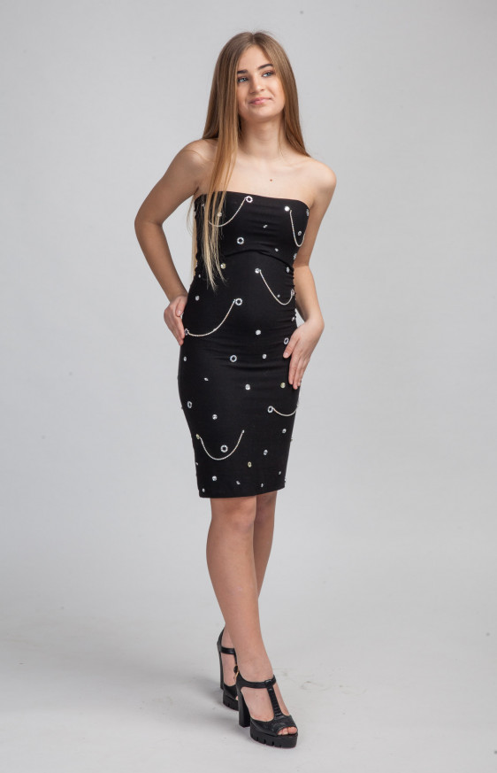Strapless mini black dress. Made of tricot with hand- stitched decorations.